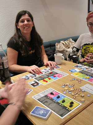 Dominion pero en el que los jugadores no tienen un mazo sino una mano de cartas y una pila de descartes. La primera partida no me interesó demasiado (quizá porque no me supe quitar el chip del